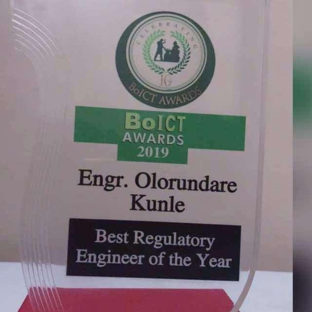 "James Kunle Olorundare of the Technical Standards and Network Integrity Department of Nigerian Communications Commission, recently in Lagos won the ‘Best Regulatory Engineer of the Year’ at the Beacon of Information and Communication Technology (BOICT) Awards.